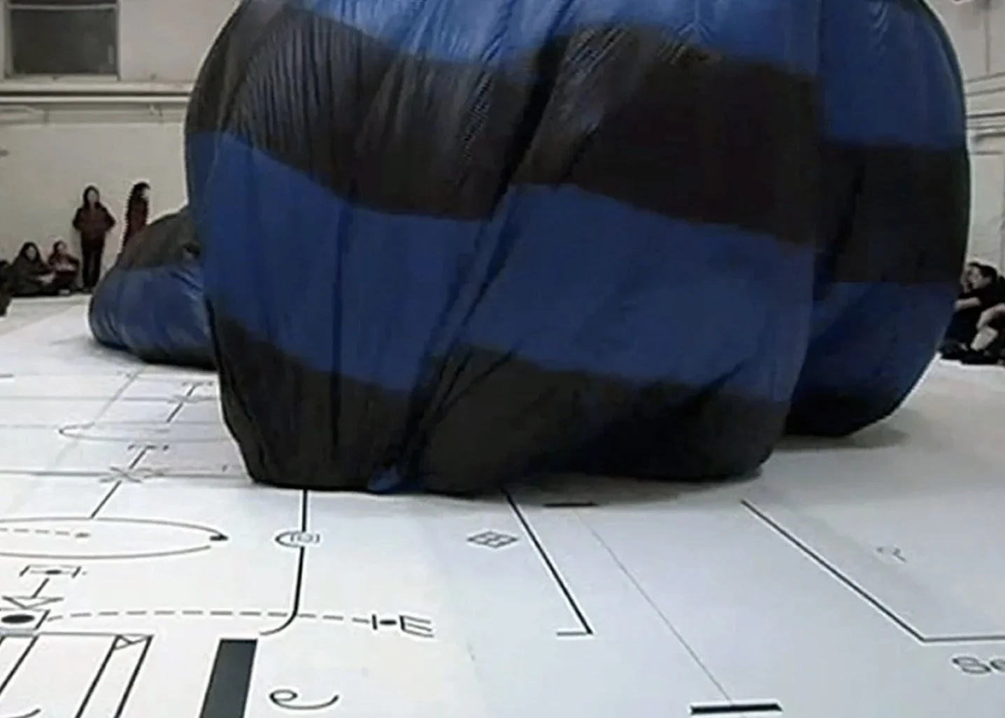 The performance was presented on the basketball court at Judson Memorial Church. A white Marley floor overlaid with black vinyl Labanotation diagrams functioned as both score and spatial instrument. The choreography draws from cooperative movement exercises, including parachute-based actions that emphasize coordination and timing, generating temporary architectures—domes and changing volumes.